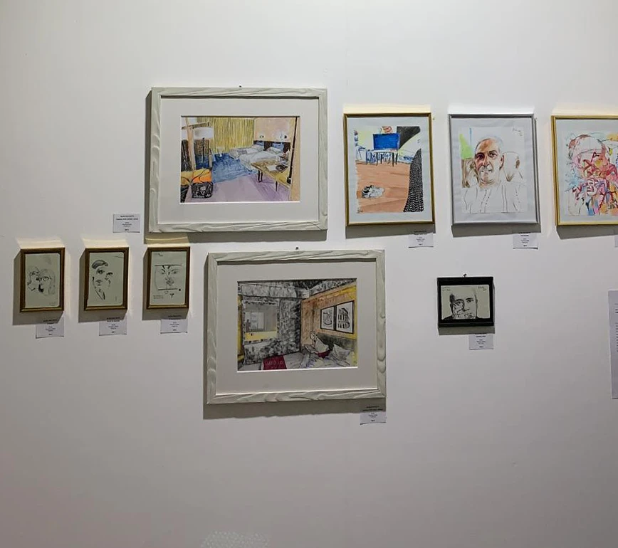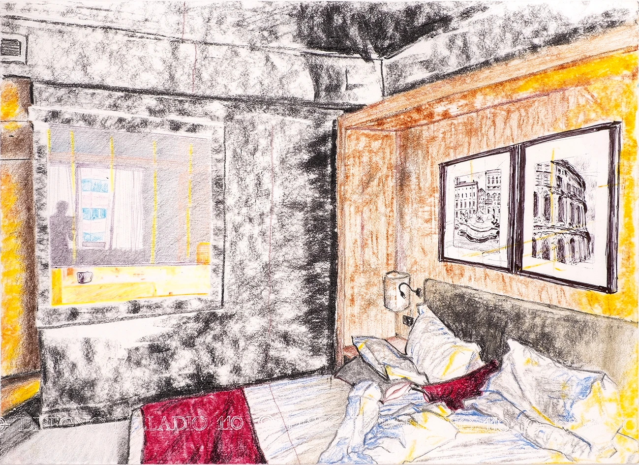Lontano dalle logiche e inconsapevole dei tempi. Tutto in fretta e da lontano scelgo un po’ di disegni 2019 e 2020. In casa simulo sul pavimento la parete. Mi interfaccio con la direttrice artistica. Arrivo a Torino con il materiale e tutto è già stato deciso al centimetro. Quali opere appendere e in quali punti. Funziona così. Meglio di così!